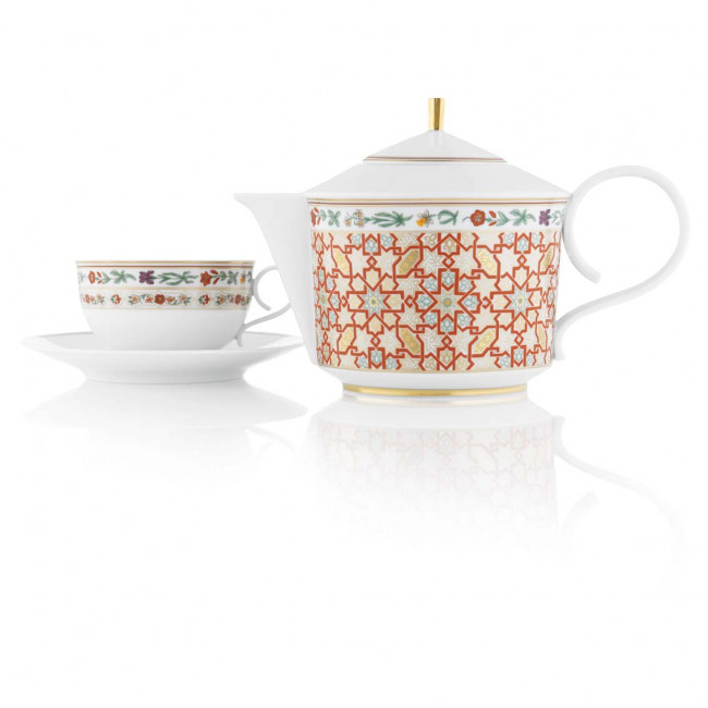 In Zusammenarbeit mit dem Hamburger Designer und Stil-Avantgardisten Peter Kempe hat sich FÜRSTENBERG, Deutschlands zweitälteste Porzellanmanufaktur, mit RAJASTHAN etwas Einzigartiges einfallen lassen: Inspiriert von orientalischen Formen, der Farbenpracht indischer Saris und den goldgeschmückten Tempelanlagen Rajasthans, ergänzten sie die präzisen geometrischen Muster der Form durch goldene Gitter aus der indischen Architektur, byzantinische Blumenmuster und Textil-Ornamente aus dem 16. Jahrhundert. RAJASTHAN entführt zu einer sinnlichen Reise in den Alten Orient – fast meint man, das Stampfen der Prunk-Elefanten beim Umzug vor dem Taj Mahal zu hören oder den Duft exotischer Gewürze in der Nase zu spüren.