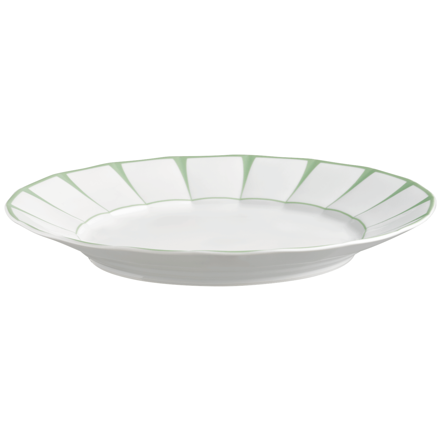The décor interprets a Grecian key motif in a modern, graphic way: crisp segments are framed by a delicate, soft green line that follows the contour with exacting consistency. The smooth glaze enhances the luminous white body and gives the surface a refined, durable finish for everyday use.