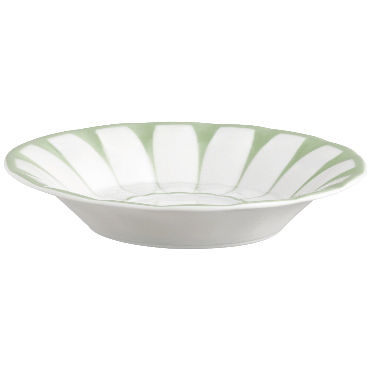 Seen from above, the saucer features a rhythm of white panels set within soft green tones, a graphic décor that feels contemporary while referencing classical ornament. The fine glaze finish enhances the crisp contours and gives the porcelain a refined, luminous depth.