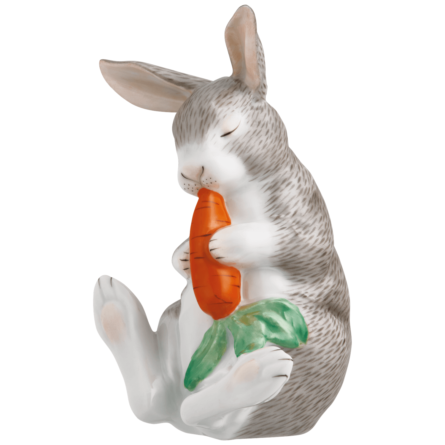In der fein ausgearbeiteten Modellage überzeugen die ruhige Haltung, die klar definierten Konturen und die sorgfältig ausgeformten Details von Ohren, Pfoten und Gesicht. Die zarte Grauzeichnung des Fells wirkt bewusst zurückhaltend und unterstreicht die plastische Tiefe, während die orangefarbene Möhre mit ihren grünen Blättern einen frischen Farbakzent setzt.
