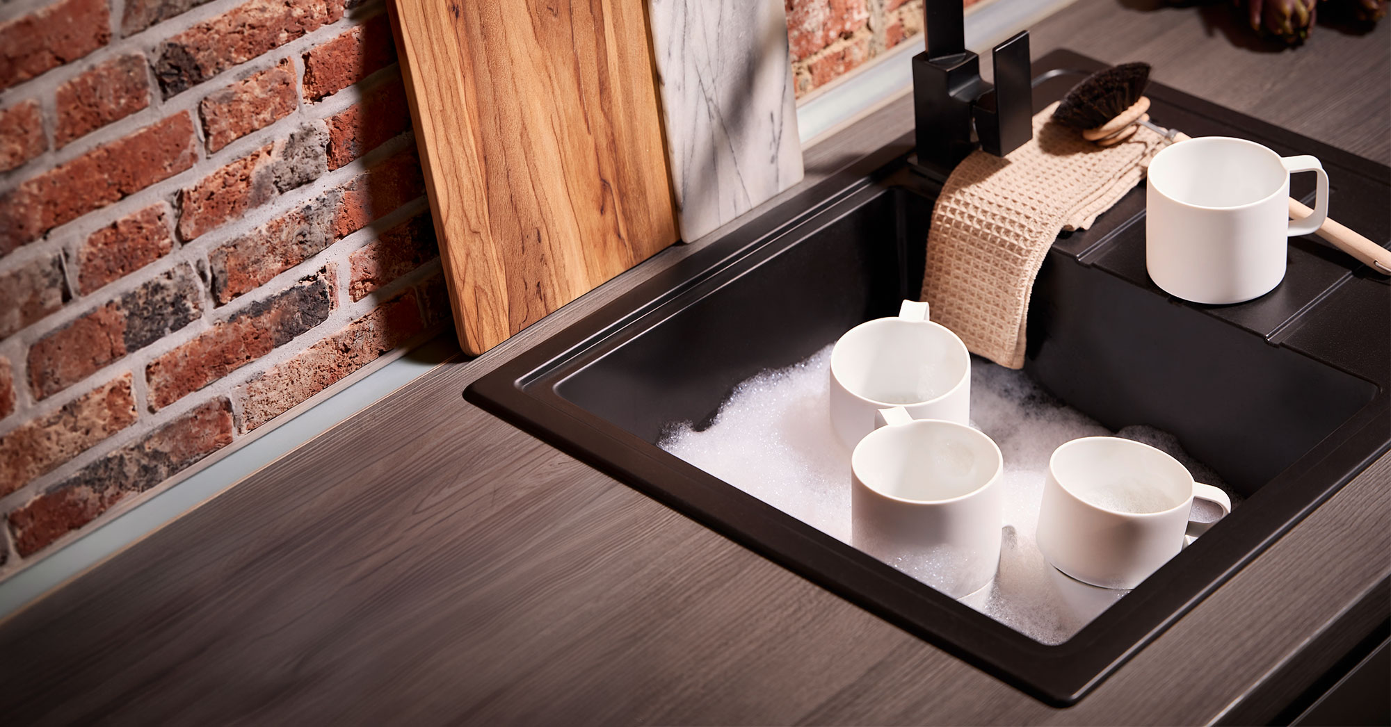 Verwenden Sie beim Spülen keine scheuernden Reinigungsmittel oder Schwämme, insbesondere keine Mikrofaser-Tücher, da diese feine Scheuerpartikel enthalten können. Zur Reinigung empfehlen wir weiche Baumwolltücher.