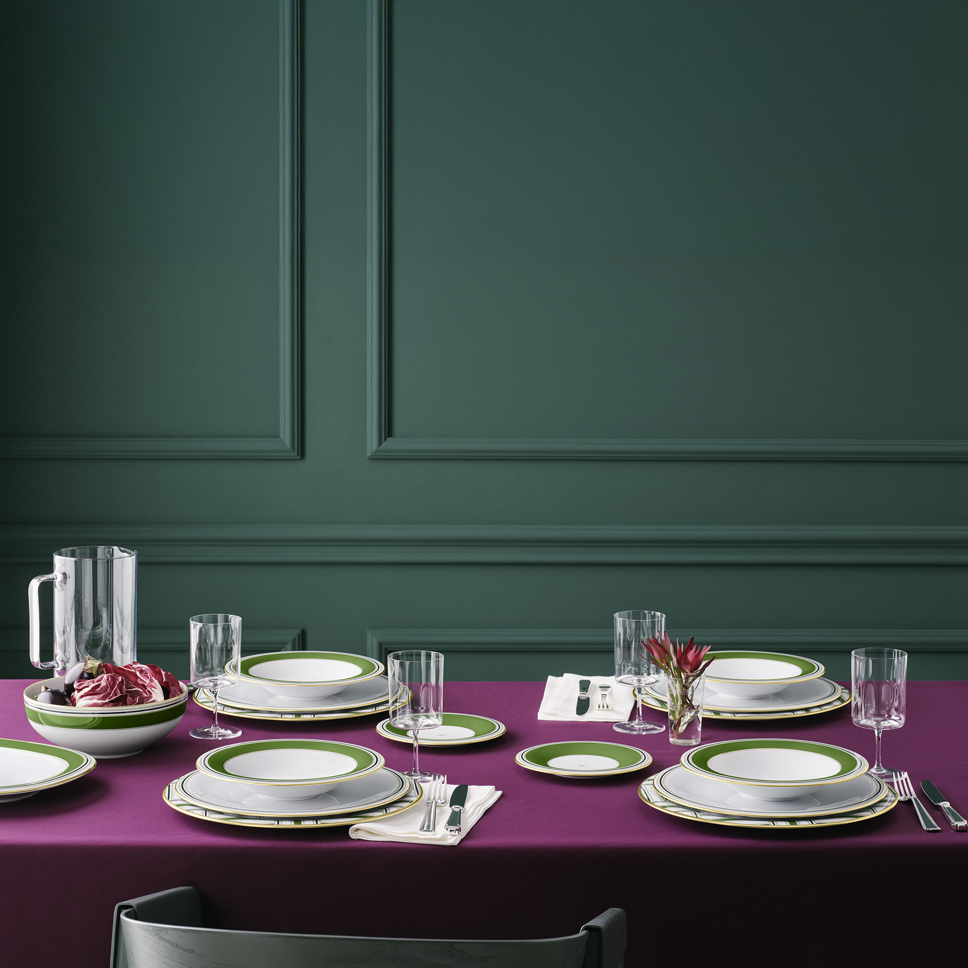 Die Kollektion FLUEN, ein Meisterwerk von Alfredo Häberli für die Porzellanmanufaktur FÜRSTENBERG, verkörpert die harmonische Verbindung zwischen Poesie und Präzision. Die ovale Platte dieser Serie besticht durch ihre geschmeidige Formsprache, die weiche Bewegungen und fließende Linien meisterhaft vereint. Das Dekor HERITAGE GREEN spielt mit weißem Grundton, akzentuiert durch edle Gold- und zurückhaltende Grüntöne, die eine elegante und zeitlose Ästhetik schaffen.