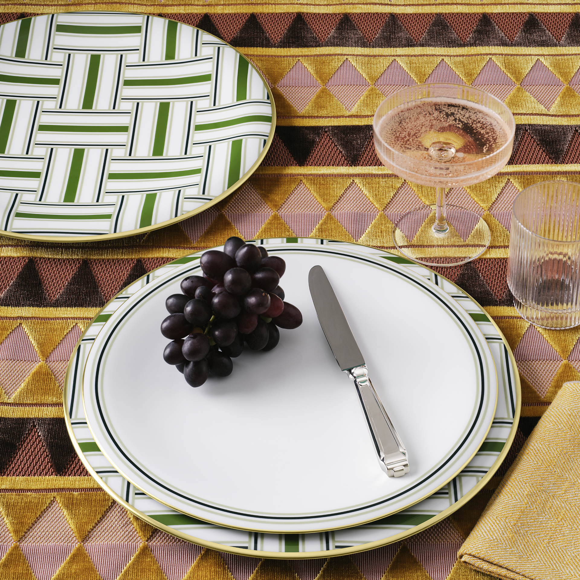 Der Speiseteller besticht durch sein elegantes Dekor HERITAGE GREEN, das mit weißen, goldenen und grünen Farbtönen eine faszinierende visuelle Dynamik bietet. Diese Farbkombination reflektiert die poetische Handschrift von Häberli, die sich durch fließende Linien und weiche Übergänge auszeichnet.