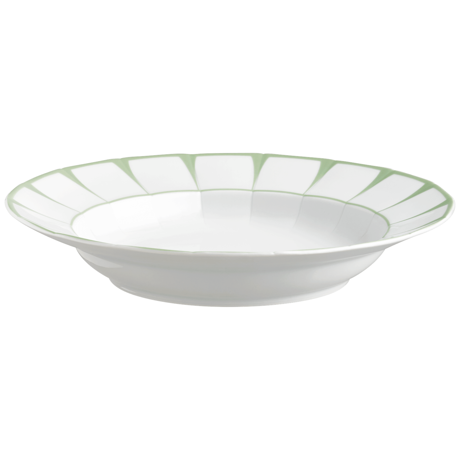 Charakteristisch ist das umlaufende Dekor am Rand: rhythmisch gesetzte Felder in einem dezenten Grün akzentuieren die Form, ohne sie zu dominieren. Die präzise ausgearbeitete Kontur, die fein geschliffenen Kanten und die gleichmäßig glatte Glasur unterstreichen die hochwertige Ausführung und machen das Porzellan im Alltag ebenso überzeugend wie beim Empfang.