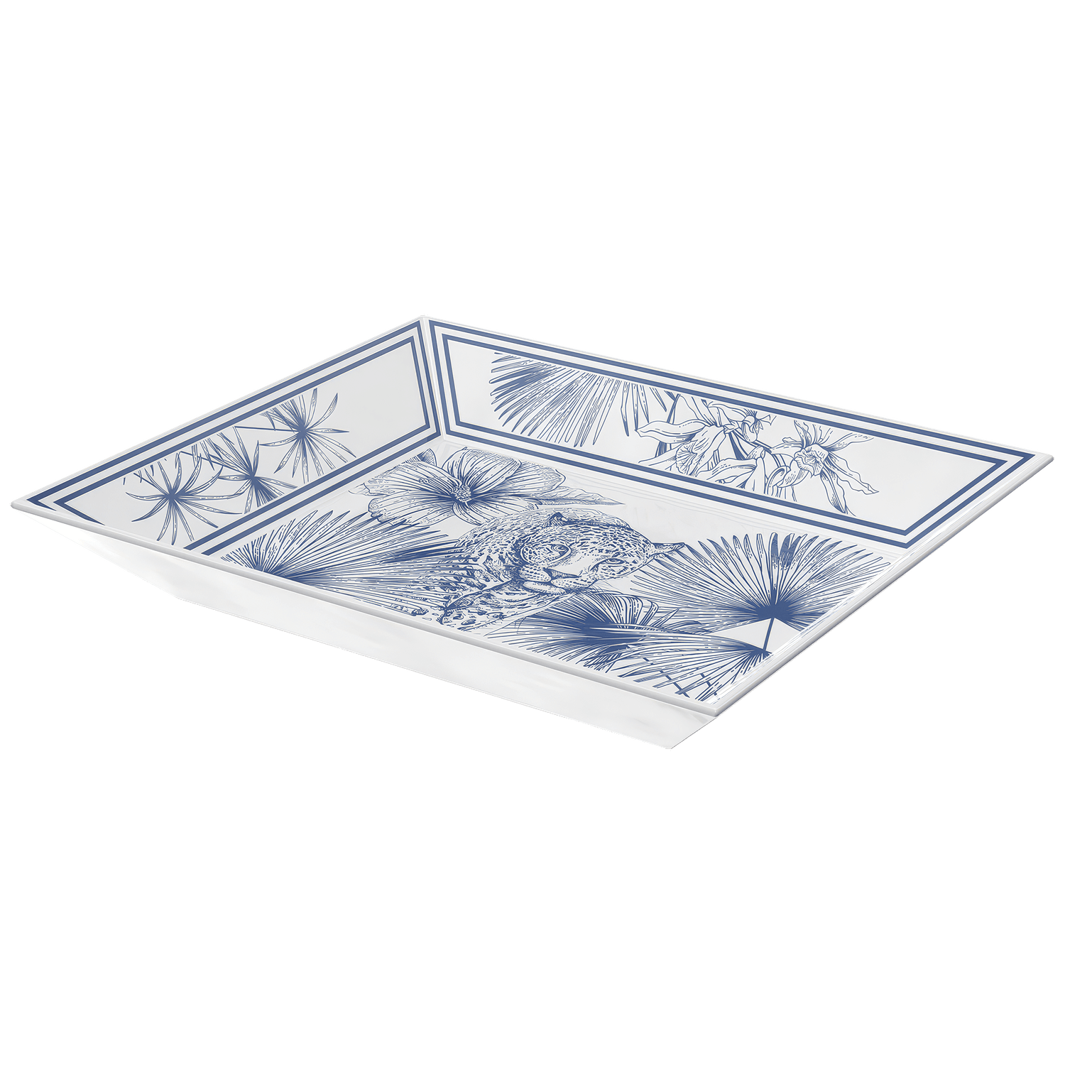 Das in Blau gehaltene Motiv von PARAÍSO BLUE zeigt eine detailreiche Dschungelwelt mit Großkatze, Pflanzen und geometrischer Rahmung. Der Dekorauftrag ist sauber konturiert und wirkt wie eine grafische Illustration, die dem Vide Poche eine souveräne, zeitgemäße Präsenz verleiht.