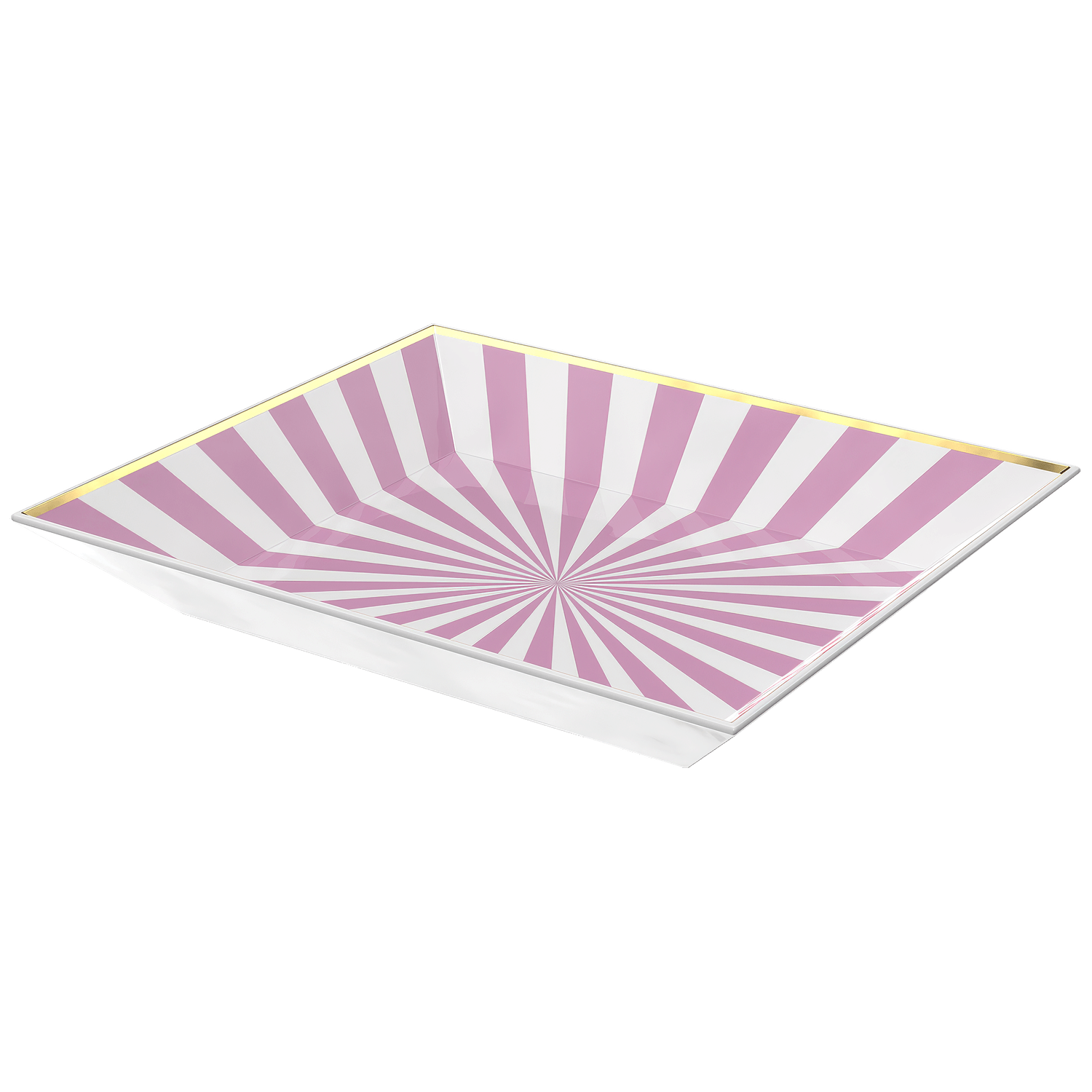 Die flache, präzise gefasste Form betont die klare Geometrie des Designs. Im Spiegelglanz der Glasur entfaltet sich ein grafisches Strahlenmotiv in roséfarbenen und weißen Farbtönen, das dem Porzellan eine moderne Tiefe verleiht und Licht wirkungsvoll reflektiert.