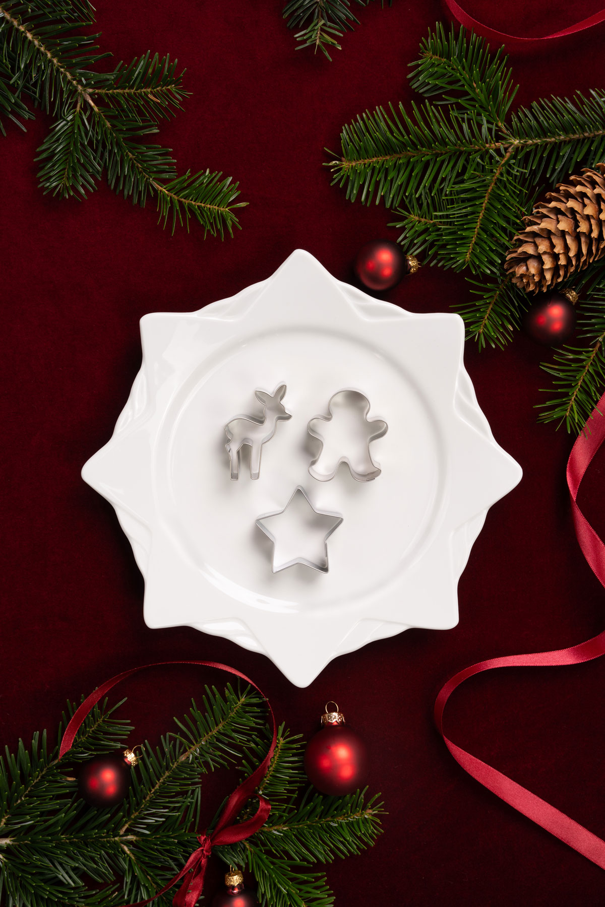 Das Weihnachts-Set | Plätzchenausstecher mit Sternenteller vereint Backfreude und feine Tischkultur. Enthalten sind drei Metall-Ausstechformen – Reh, Stern und Männchen – sowie ein Teller mit sternförmig konturierter Fahne. Sie rahmt den Spiegel präzise und setzt Gebäck, Pralinen oder kleine Desserts wirkungsvoll in Szene.
